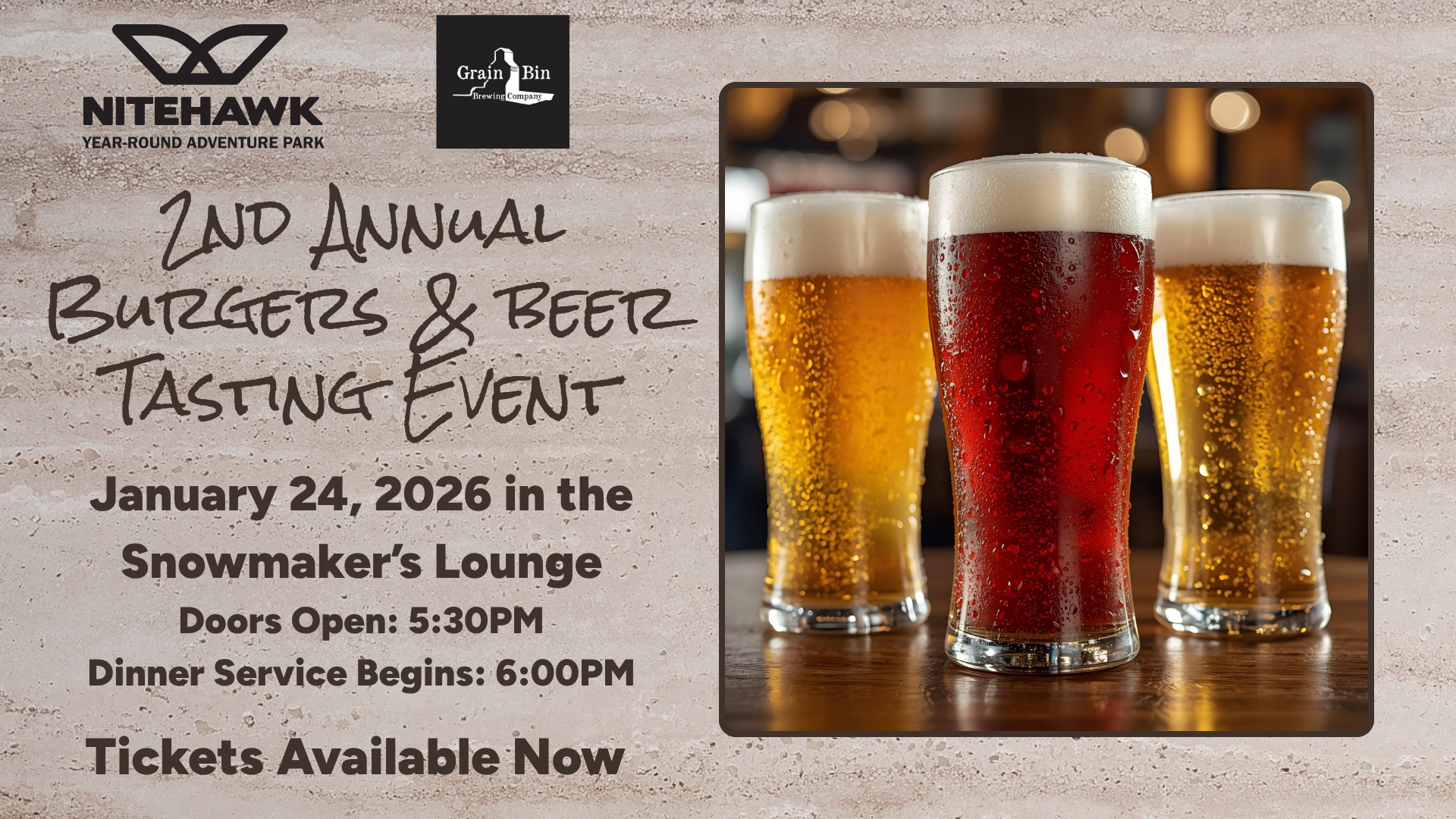 Join Nitehawk Year Round Adventure Park and Grain Bin Brewing Company for a Burgers and Beer Tasting Experience Saturday, January 24, 2026 from 5:30PM – 9:00 PM in the Snowmaker’s Lounge.