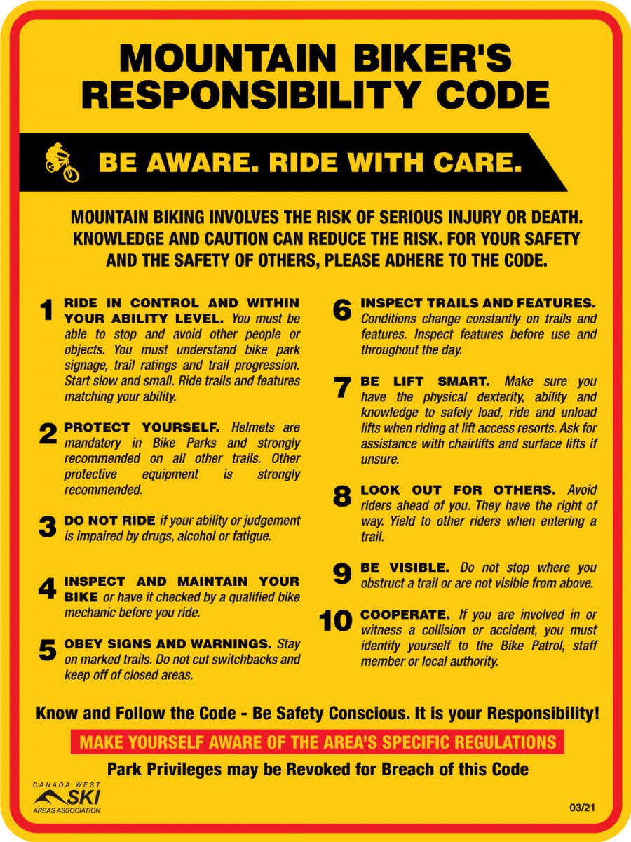 Mountain biking involves the risk of serious injury or death. Knowledge and caution can reduce the risk. For your safety and the safety of others, please adhere to the code.